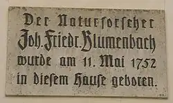 - Am 22. Januar 1940, dem 100. Todestag von Blumenbach, wurde die vom Gothaer Bildhauer Victor Embser (1879–1950) geschaffene Gedenktafel am Geburtshaus Blumenbachs enthüllt. Dadurch blieb dieses Haus bei dem Flächenabriss der westlichen Altstadt stehen.[42]