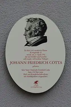 • Rudolf Schmidt: Cotta, Johann Friedrich Freiherr von. In: Rudolf Schmidt: Deutsche Buchhändler, Deutsche Buchdrucker. Beiträge zu einer Firmengeschichte des deutschen Buchgewerbes. Band 1: Abel – Dyck. Weber, Berlin 1902, S. 147–157.