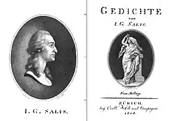 Er traf Matthisson, der mit seinem Arbeitgeber nach Rennaz (Amt Aigle) übergesiedelt war und Salis einige Monate später seinerseits in Malans besuchte.[62] Dort lernte Matthisson die künftige Lebensgefährtin von Salis kennen.[63] Er schrieb darauf: «Gewiss, ihm fiel ein schönes Loos; denn die harmonische Vereinigung der sittlichen Grazie mit dem reinsten Natursinne und der sanftesten Weiblichkeit, verheisst ihm unwandelbare Glückseligkeit […].»[64] Zusammen machten die beiden Freunde die erste Sammlung der Gedichte von Salis druckfertig.[65] Sie erschien wie die späteren Auflagen beim Zürcher Verleger und Politiker Johann Heinrich Füssli (1745–1832), mit dem Salis befreundet blieb. Schliesslich konnte dieser, nachdem der Vater ihm sechs Jahre lang die Zustimmung verweigert hatte, an seinem 31. Geburtstag (in Masans bei Chur) Ursina heiraten.