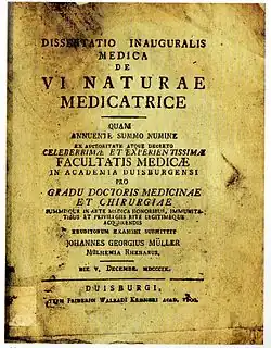 Johann Georg Müller war ein Sohn des Schneiders Johann Peter Müller und der Gertrud Koch. Vermutlich besuchte er in Mülheim die Lateinschule und danach die Zentralschule in Köln, an der auch angehende Mediziner ausgebildet wurden, jedoch liegen für beide Annahmen keine Nachweise vor. Einer seiner Studienfreunde war Johann Jacob Noeggerath, der ebenfalls in Köln ausgebildet wurde. Bis 1803 war im nachrevolutionären Frankreich die Ausübung der ärztlichen Kunst ohne Prüfung zulässig, danach musste zumindest die Prüfung an einer entsprechenden Institution nachgewiesen werden. Zur Promotion schrieb sich Johann Georg Müller am 3. Dezember 1809 an der Universität in Duisburg ein[1], zwei Tage später legte er dort bereits bei Professor Daniel Erhard Günther die Prüfung mit einer 14-seitigen Arbeit De vi naturae medicatrice ab, in der er sich auf den Animisten Georg Ernst Stahl bezog, dessen Prinzipien er auch später noch verfocht. Die Dissertation widmete er den Mitgliedern des Düsseldorfer Medizinalkollegiums, darunter Johann Gotthelf Leberecht Abel. Welche Beziehung Müllers zu diesem Kollegium bestand, ist unbekannt. Möglicherweise hatte er jedoch einen Teil seiner Ausbildung in Düsseldorf absolviert. Dieses Medizinalkollegium war 1708 ins Leben gerufen worden und wurde 1808 aufgelöst.