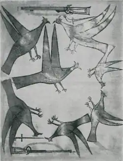 - Dekorative Zeichnung mit Vögeln, Kreide und Buntstift[12]