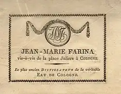 Johann Maria Farinas (I) Handel mit Eau admirable beschränkte sich zunächst auf den Ladenhandel in Köln und den Verkauf auf den Messen in Frankfurt am Main. Eine Versendung der Ware nach auswärts ist erstmals für das Jahr 1716 in den Briefkopierbüchern des Unternehmens belegt, als Farina zwölf Flaschen zu jeweils vier Livres an eine Madame Billy nach Aachen schickte.[12] In den 1720er Jahren blieb der Versand mengenmäßig noch gering, die Verbreitung erstreckte sich aber bereits bis nach Paris, wohin Farina im November 1721 die erste Lieferung von 24 Flaschen schickte. In den 1730er Jahren erweiterte sich der Kundenkreis. In der Firmenhistorie registrierte Mönckemeier für die Jahre zwischen 1730 und 1739 den Versand von rund 3.700 Flaschen an insgesamt 39 Adressen. Farina selbst erwähnte in einem Brief vom 9. August 1737 Sendungen nach Frankreich, Spanien, Portugal, England, die Niederlande, Deutschland und Italien.[13] Insbesondere beim Adel erfreute sich das Eau admirable wachsender Beliebtheit. In einem Schreiben vom 31. August 1734 berichtete Farina dem Berliner Kaufmann Fromerey, er habe auch den preußischen König Friedrich Wilhelm beliefert.[14] Offiziere der französischen Armee, die nach dem Ende des Polnischen Thronfolgekriegs aus dem Rheinland in ihre Heimat zurückkehrten, schufen der Ware einen Markt in Frankreich. Aus dieser Zeit datiert auch die Bezeichnung als „Eau de Cologne“, die in den Unternehmenspapieren erstmals in einem Brief Farinas an den Baron von Laxfeld in Münster vom 22. Juni 1742 auftaucht: