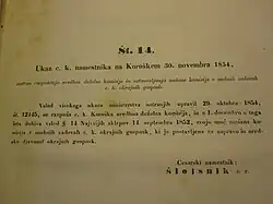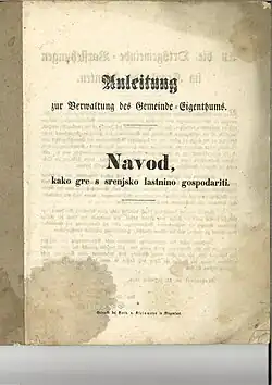 - ↑ Anleitung zur Verwaltung des Gemeinde-Eigenthums/Navod, kako gre s srenjsko lastnino gospodariti. [Verordnung ?] Nr. 11914 vom 24. Dezember 1850, gedruckt bei Ferd. V. Kleinmayr in Klagenfurt, [gezeichnet :] Der Statthalter von Kärnten : Schloißnigg/Deželni poglavar na Koroškem : Šlojsnik, 73 S. (mit Formularen in beiden Landessprachen)