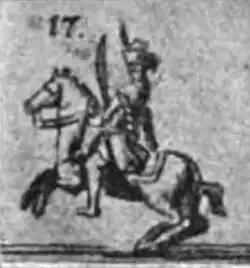 Zeitgenössische Darstellung und Beschreibung eines Kroatischen Reiters in der Leibgarde des sächsischen Kurfürsten bei einer Parade im Jahr 1678: „17. Herr Johann von Peraynsky, Obrist-Lieutenandt von der Leib-Guardie, Cammerherr und Ambts-Hauptmann zu Moritzburg, in einer Leoparden-Haut.“[4]