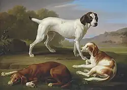 Ein English Pointer und zwei Setter vor einer klassischen Landschaft