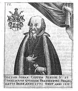 Johann Köppen erwirbt die professionem iuris, die Doktorwürde beider Rechte in Frankfurt/Oder. Ab 1560 ist er anschließend Ordinarius der Juristenfakultät (Lehrstuhlinhaber) an der Einrichtung, an der er seine Doktorwürde erzielte. Dr. Johann Köppen sen. wurde 1564 Rat beim Markgrafen Johann von Küstrin (1513 – 1571) dem Bruder von Joachim II. Hector (1505 – 1571). Ab diesem Zeitpunkt ist er für den „Marggraf Johannes von Cüstrin in Bestallung“ (einsetzen in ein Amt). 1566 holt der Kurfürst Joachim II. Hector (Kurfürst von 1535 – 1571) Dr. Johann Köppen nach der Residenzstadt Berlin, weil er die großen Vorzüge und das umfassende Wissen des Dr. Johann Köppen erkannt hat. Dr. Johann Köppen sen. wird vortragender Rat. Als der Kurfürst Joachim II. 1571 stirbt übernimmt sein Sohn Johann Georg den Treuenbrietzener Bürgersohn Dr. Johann Köppen sen. unter gleichzeitiger Beförderung zum geheimen Kammer- oder Kabinettsrat.