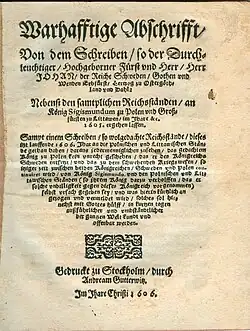 • Flugschrift: Warhafftige Abschrifft/ Von dem Schreiben/ so der Durchleuchtiger/ Hochgeborner Fürst und Herr/ Herr JOHAN/ der Reiche Schweden/ Gothen und Wenden Erbfürst/ Herzog zu Ostergöthland und Dahl: Nebenst den samptlichen Reichsständen/ an König Sigismundum zu Polen und Großfürsten zu Littawen/ im Jhare &c. 1605. ergehen lassen....Gedruckt zu Stockholm/ durch Andream Gutterwitz. Im Jhare Christi 1606. (Bibliographie: Warmholtz 3300 und Collijn 1600-talet kennen die deutsche und die schwedische Ausgabe; nicht im VD 17!)