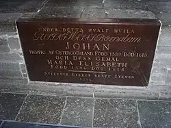 Anfang des Jahres 1619 wurden Johann und seine Frau Marie Elisabeth, die im August 1618 gestorben war, im Dom zu Linköping bestattet, wo heute noch eine Gedenktafel auf ihren Bestattungsort hinweist. Bereits 1618 erhielten er und seine Frau eine Messe und einen Nachruf durch Sylvester Phrygius.[20]