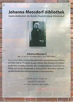 - ↑ Zitiert nach der Rede von Ruth Ellerbrock anlässlich der Enthüllung einer Gedenktafel für Johanna Moosdorf am 12.7.2006. Auf: Webseite des Bezirksamts Charlottenburg-Wilmersdorf. Abgerufen am 21. November 2019.