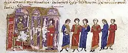 Johannes-Sembat beugt sich Basileios II., Miniatur der Skylitzes Matritensis.
