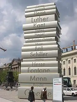 - Gutenberg-Statue am Eingangsportal der Hessischen Landesbibliothek in Wiesbaden