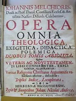 - ↑ De Vita Et Obitu Johannis Melchioris, Celeberrimi Scholæ Herbornensis Theologi