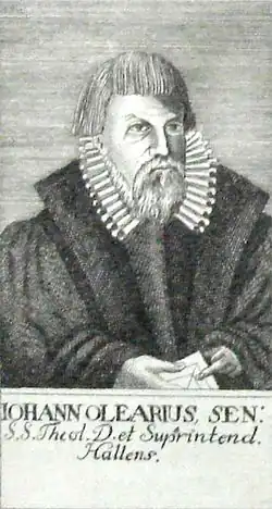 - ↑ siehe zu dieser Familie Martina Wermes: Olearius. In: Neue Deutsche Biographie (NDB). Band 19, Duncker & Humblot, Berlin 1999, ISBN 3-428-00200-8, S. 515 (Digitalisat).