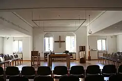 Der Kunstschreiner Primo Lorenzetti schuf mit der Kirche Johannes XXIII. ein Gesamtkunstwerk, dessen einzelne Elemente sich miteinander durch ihre Symbolik verbinden. Vor der Eingangstür zur Kirche im ersten Stock befindet sich das Weihwasserbecken. Eine metallene Halbkugel birgt eine Glasschale, in der sich das Weihwasser befindet. Wie alle anderen auf dem Boden stehenden Elemente der Innenausstattung besteht auch dieses Objekt aus zwei Holzarten: Die senkrechten Teile sind aus Ulmenholz, die waagerechten Teile aus Esche gefertigt. In der Mitte der Frontwand hängt ein gleichschenkliges Kreuz, das seine Entsprechung im Fassadenkreuz an der Aussenwand der Kirche findet. Auf der Seite des Altarbezirks steht an der Wand ein Zitat aus dem Galaterbrief (Gal 5, 13): „Ihr seid zur Freiheit berufen – nutzt sie zum Dienste und zur Liebe untereinander.“ Der Altar ist ein einfacher Holztisch, der den Abendmahlscharakter der Eucharistiefeier unterstreicht. Die Konstruktion des Tisches und aller liturgischen Möbel beruhen auf dem Quadrat, dem Kreis und der unendlichen Zahlenreihe Pi. Das Quadrat „ist das Symbol des Festen, Unveränderlichen und der Ewigkeit. Der Kreis hingegen ist die einfachste Form der Darstellung des Unendlichen, des Ewigen.“[9]