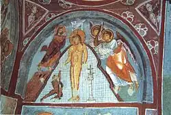 In der für die mittelalterliche Ikonographie einflussreichen Legenda Aurea wird Johannes entsprechend der alttestamentarischen Weissagung in Maleachi 3,1[31] auch wie ein Engel beschrieben. In der Bildtradition der Ostkirche wird Johannes deshalb meist mit großen Flügeln dargestellt. Johannes der Täufer erscheint auf der Ikonostase in orthodoxen Kirchen in der Regel an zentraler Stelle als Teil der Deësis oder direkt rechts neben der zentralen Christus-Ikone, die Gottesmutter links von Christus.