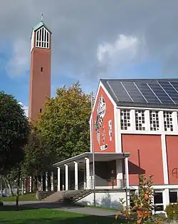 Unter dem großen Kirchenraum befindet sich ein Untergeschoss mit mehreren Gemeinderäumen. Über eine Treppe am Westgiebel gelangt man in die Kirche und in einen Laubengang, der zum Glockenturm führt. Der getrennt stehende Glockenturm wurde als schlanker Campanile mit einem rhombischen Pyramidendach in Betonrahmenbauweise[3] errichtet.[4] Er ist 40 Meter hoch und beherbergt drei Bronzeglocken, die in der Glockengießerei Petit & Gebr. Edelbrock gegossen wurden[3] und in g', b' und c'' erklingen.
