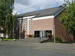 Hinter dem Eingangsbereich befindet sich eine nur mit Glaswänden abgetrennte Taufkapelle. Über Eingangsbereich und Taufkapelle liegt eine Empore mit der Orgel und Nebenräumen. Die Sakristei schließt seitlich an das Kirchenschiff an. Die Kirche war zunächst auf 460 bis 520 Sitzplätze ausgelegt. Das Kirchenschiff erhält durch die farbigen Bienenwabenfenster in den Seitenwänden direkten Lichteinfall.