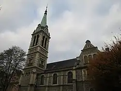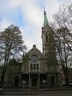 Die Kirche ist als dreischiffige Emporen-Basilika mit Querhaus und Treppentürmen zu den Emporen auf allen vier Seiten gestaltet. Drei Treppentürme verfügen über Haubendächer, der vierte rechterhalb der Hauptfassade ist zugleich Uhr- und Glockenturm und überragt daher das Kirchenschiff deutlich. Die Uhrengiebel des Turmes sind wie die Giebel des Schiffs in der Formensprache der niederländischen Renaissance gehalten und mit einem Segmentbogen abgeschlossen. Bekrönt wird der Turm von einem Spitzhelm aus Kupfer. Der Glockenstuhl birgt ein vierstimmiges Geläute, das in der Tonfolge c' e' g' c erklingt und im Jahr 1898 von der Glockengiesserei H. Rüetschi hergestellt wurde.[3] Die Hauptfassade wird dominiert von einem Rosettenfenster, unter dem sich drei Rundbogenfenster befinden. Die Steinhauerarbeiten sind in Granit, Bollinger Sandstein und Kunststein ausgeführt. Das Vordach wurde im 20. Jahrhundert dazugebaut.