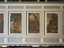 Westempore Von Süd nach Nord: 1. Isaaks Opferung 2. Isaaks segnet Jakob 3. Jakob und die Himmelleiter 4 Der Kampf am Jabbok. 5. Josef flieht vor der Frau des Potifar. 6 Josef gibt sich seinen Brüdern zu erkennen. 7. Mose und der brennende Dornbusch, nach einer Vorlage von Matthäus Merian gemalt. 8. Mose mit den Gebotstafeln und das goldene Kalb, nach einer Vorlage von Matthäus Merian gemalt. 9. Der Apostel Simon. 10. Figur. 11. Der Prophet Ezechiel, nach einer Vorlage von Christoph Weigel gemalt. 12. Daniel, nach einer Vorlage von Christoph Weigel gemalt.