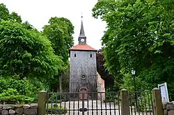 Der älteste Teil der Kirche ist das Kirchenschiff. Es wurde aus Feldsteinen im 13. Jahrhundert errichtet und hatte anfangs eine flache Holzdecke, die später durch ein Gewölbe ersetzt wurde. An den Ecken wird das Mauerwerk durch Stützpfeiler verstärkt. Die schmalen Schlitzfenster weisen in ihrer Form auf den Übergang von der Romanik zur Gotik hin. Der aus Feld- und Backsteinen errichtete Chor mit Nordsakristei ist jünger, er wurde im ausgehenden vierzehnten Jahrhundert erbaut[6] und schließt mit drei Seiten eines Oktogons. Der Chor ist gewölbt und etwas höher als das Kirchenschiff. Die Trennung von Chor und Schiff bildet ein Triumphbogen mit einem Triumphbalken, auf dem eine Kreuzigungsgruppe steht. Westlich des Langhauses ist ein hölzerner Turm angebaut, der in seiner jetzigen Form seit 1680 steht. Die Verbretterung wurde auf eine mächtige Balkenkonstruktion aufgebracht. In der Turmspitze befindet sich eine Turmuhr. Bereits vorher soll ein ebenfalls hölzerner Turm vorhanden gewesen sein. Beleg dafür ist die noch vorhandene Bronzeglocke aus dem Jahr 1495. An der nördlichen Seite des Kirchenschiffes befindet sich ein Sakristeianbau, an der Südseite gibt es einen weiteren Anbau mit einem gotischen Giebel.