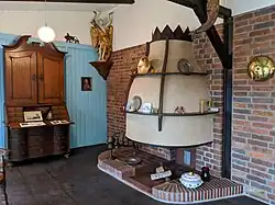 Die Waldhütte, die die Geschwister (John Heartfield und Wieland Herzfelde) an ihre Kindheit bei Salzburg erinnerte, ist ein Holzplattenbau mit einem Dach nach alpenländischem Vorbild und einer Halbholzverkleidung, die an ein Blockhaus erinnert. Das Gebäude besteht aus Teilen einer ehemaligen Sanitätsbaracke der Wehrmacht des Flugplatzes Strausberg.[14][15][16] Eine Veranda mit begehbarem Flachdach wurde später hinzugefügt.[10] Viele Details, wie die Vitrinenschränke und der Kamin,[17] sind nach den Vorgaben Heartfields gestaltet.[1]