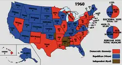 Kurz nach seiner Nominierung auf dem Parteitag machte Kennedy am 14. Juli trotz der Vorbehalte seines Bruders Robert, der den Wahlkampf leitete, seinen vormaligen Rivalen Johnson zu seinem Running Mate für das Amt des Vizepräsidenten. Eine Überlegung hierbei war, dass er Johnson in der Funktion als Vizepräsident besser unter Kontrolle hatte denn als Mehrheitsführer im Senat, wo er potenziell das Weiße Haus in der Gesetzgebung blockieren konnte.[102] Kennedy hoffte damit auch texanische Wähler – Johnson stammte aus Texas – und die Südstaaten insgesamt für sich zu gewinnen, die Kennedy skeptisch gegenüberstanden. Entsprechend gab es bei den liberalen Demokraten im Norden Widerstand gegen Johnson. In der Tat gelang es dem Kennedy/Johnson-Team, Texas bei der Wahl mit dem bis dahin knappsten Popular Vote bei einer Präsidentschaftswahl zu gewinnen.[103] Eine wichtige Rolle bei der Entscheidung für Johnson spielte Sam Rayburn, der Sprecher des Repräsentantenhauses war, und sich zuerst gegen Johnson als Running Mate ausgesprochen hatte.[104] Nach Alfred E. Smith bei der Wahl 1928 war Kennedy erst der zweite katholische Präsidentschaftskandidat einer großen Partei in der amerikanischen Geschichte.[105]