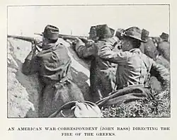 - ↑ Richard Harding Davis, „With the Greek Soldiers“, in: Harper’s New Monthly Magazine, Vol. XCV (95), No. DLXX (570), S. 813–831, dort auf S. 828 ein Foto mit folgender Bildunterschrift: „An American war correspondent (John Bass) directing the fire of the greeks“, https://archive.org/details/harpersnew095various/page/828/mode/2up