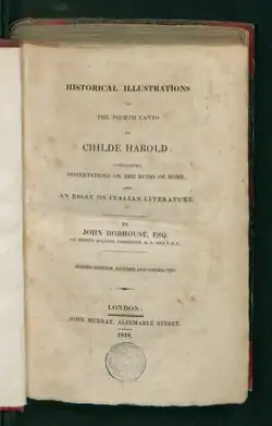 Im Januar 1815 war Hobhouse Trauzeuge von Byron gewesen, und er begleitete ihn, als dieser im April 1816 wieder nach Italien reiste. Hier entstanden seine Historical illustrations des vierten Gesang (Canto) von Byrons Childe Harold’s Pilgrimage; Byron hatte Hobhouse diesen Gesang gewidmet.