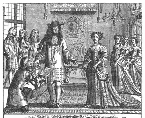Ogilbys Biographin Van Eerde mutmaßt, es sei ein Exemplar von Ogilbys Bibel gewesen, auf die Karl II. nach seiner Rückkehr den Krönungseid geschworen habe.[40] Und Schuchard gibt eine Anekdote wieder, nach der Ogilby dem König im Schloss von Whitehall ein vollständig auf Pergament gedrucktes Exemplar seiner Bibel überreicht habe.[41] Gesichert ist allerdings nur, dass Ogilby von Beginn der Stuart-Restauration an in der besonderen Gunst des Königs stand und sein Renommee als Dichter und Verleger ihm den Auftrag verschaffte, den Krönungsfestzug Karls II. mitzugestalten und in einem Druckwerk für spätere Generationen festzuhalten.