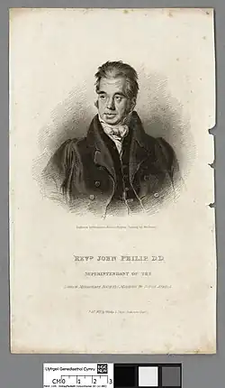 John Philip war der Sohn eines schottischen Lehrers. Nach einer Ausbildung zum Tuchhändler arbeitete er als Buchhalter in Dundee und besuchte dann das Wesleyan Theological College in Hoxton. 1804 wurde er zum Pfarrer einer Kongregationalistengemeinde in Aberdeen berufen. 1822 wurde er als Direktor der LMS zusammen mit seinem schottischen Kollegen John Campbell auf eine Missionsstation nach Südafrika entsandt. Als Superintendent sollte er dort die Arbeit der LMS neu organisieren und überwachen.[2] Dort engagierte sich Philip für die landlosen Arbeiter, die Khoi, die den weißen Farmern und Händlern als billige Arbeitskräfte dienten. Nach der Abschaffung der Sklaverei im britischen Empire startete er in Südafrika eine Kampagne „für gleiche Bürgerrechte für alle Untertanen Seiner Majestät“, um die minimalen Bürgerrechte für die freigelassenen Sklaven weiter zu verbessern. Philip engagierte sich für die Erhaltung der an die Kapkolonie angrenzenden Kleinstaaten der Xhosa, Griqua und Sotho und deren indigener Interessen. Philip zog sich den Hass vieler Landsleute zu, als er vor einem parlamentarischen Komitee in London sowohl die britischen Behörden als auch die weißen Siedler für einen Grenzkrieg verantwortlich machte.[2] Philips Leben war geprägt von der Überzeugung, dass das Evangelium Menschen und Gesellschaften verändern sollte. Nach seinem Tod im Jahr 1851 wurde er auf einem Friedhof in einem Township beigesetzt. Philip gilt als Gründervater des Liberalismus in Südafrika.[2]