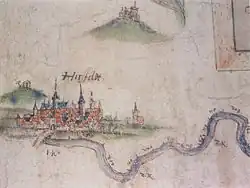 Erster Abschnitt aus der um 1596 entstandenen „Fulda-Stromkarte“: Vedute von Hersfeld mit der alten Fuldabrücke, der Klauskirche und angedeutet dem Galgenplatz und dem Frauenberg mit Kloster