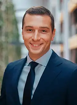 Im November 2022 wurde er im Alter von 27 Jahren mit mehr als 84 Prozent der knapp 40.000 abgegebenen Mitgliederstimmen zum Parteivorsitzenden des RN gewählt. Er setzte sich bei der online abgehaltenen Wahl gegen seinen Konkurrenten, Louis Aliot, durch und war der erste Vorsitzende seiner Partei, der nicht direkt der Familie Le Pen angehörte.[14][15] 2024 war er Spitzenkandidat seiner Partei bei der Europawahl.[16] Er ist in der zehnten Legislaturperiode (2024 bis 2029) Vorsitzender seiner Fraktion Patrioten für Europa, daher qua Amt Mitglied der Konferenz der Präsidenten und Mitglied im Ausschuss für auswärtige Angelegenheiten.[17]
