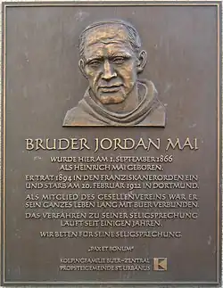 Nach dem Tod von Jordan Mai, der schon zu Lebzeiten von den Menschen sehr geschätzt wurde, setzte umgehend eine stürmische Verehrung durch die Bevölkerung ein. Scharenweise pilgerten die Menschen zu seinem Grab. Der Grabhügel musste stetig erneuert werden, da die Erde bis nach Übersee mitgenommen wurde. Zuletzt sah die Friedhofsverwaltung sich gezwungen, das Grab mit einem Gitter zu umgeben und mittels einer Platte abzudecken. Im Jahr 1932 ordnete Erzbischof Caspar Klein die Erhebung der Gebeine an, zwei Jahre später begann der bischöfliche Informationsprozess als Vorbereitung seiner Seligsprechung. Als seine Gebeine im Jahre 1950 vom Ostenfriedhof in die Dortmunder Franziskanerkirche übertragen wurden, nahmen daran annähernd 100.000 Menschen teil. Infolge der Liturgiereform des Zweiten Vatikanischen Konzils wurde die ursprünglich vor dem Altar gelegene Grabstätte Mitte der 1960er-Jahre in den rechten Seitenflügel der Franziskanerkirche verlegt.[3]