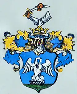 1816: In Blau ein natürlicher Pelikan in grünem Neste, mit dem Schnabel seine Brust ritzend und mit dem heraustropfenden Blute seine drei Jungen atzend. Kleinod: Geharnischter gebogener Arm, in der Faust einen Krummsäbel mit goldenem Kreuzesgriffe haltend, dessen Spitze durch den Hals eines vom Rumpfe getrennten, mit Turban versehenen, schnurrbärtigen Türkenschädels gestoßen erscheint.[12]