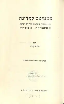 - Mi-mandat li-medinah : yoman milḥemet ha-shiḥrur shel ʻam Yisraʼel, 29 be-November 1947-12 be-Mai 1949. Jerusalem: Rubin Mass, 1952 (he)