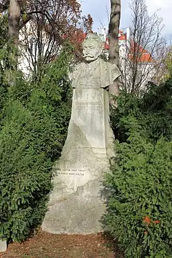 Die Büste war ursprünglich ein Bronzeguss, der im Zuge des Zweiten Weltkrieges eingeschmolzen wurde. Aus dem erhalten gebliebenen Gipsabguss fertigten die Vereinigten Wiener Metallwerke[2] um 1953 eine Steinguss-Büste, und mit dieser wurde dann das Denkmal wieder vervollständigt.[3]