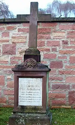 Weihbischof von Kolborn starb am 20. Mai 1816 und wurde auf dem neuen Kirchhof (Altstadtfriedhof Aschaffenburg), den er selbst im Jahre 1809 geweiht hatte, begraben. Seiner Begräbnuß ist dahier noch kein Gleichnuß gewesen, denn sie war mehr als prachtvoll. Alles wollte derselben beiwohnen.[4] Seine letzte Ruhestätte fand er unter dem Kreuz aus dem 1811 aufgelassenen Friedhof bei der Kirche St. Agatha, das auf den neuen Friedhof versetzt wurde, bei den Priestergräbern.[5][6]