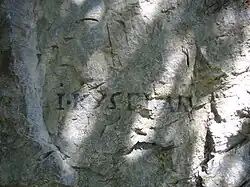 Ein eingravierter Kyselak-Schriftzug befindet sich an einem Obelisken im Wiener Schwarzenbergpark. Seine Echtheit ist umstritten, allein schon deswegen, weil Kyselak seinen Namen stets mit Farbe geschrieben und niemals eingraviert hat.[8][6][9] In dieser Tradition stehen später auch „Kilroy was here“ und Peter Ernst Eiffe.