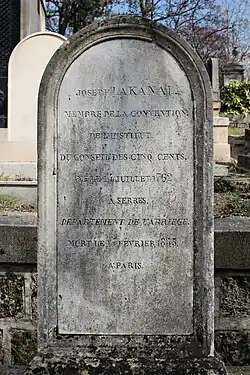 Lakanal stirbt schließlich am 14. Februar 1845 in Paris, seine junge Gemahlin und ihr junges Kind trotz seiner langen Karriere in ärmlichen Verhältnissen hinterlassend, und wird im Friedhof Père-Lachaise begraben. Sein Grab im 11. Abschnitt ist ein kostenloses Zugeständnis auf Anweisung des Präfekten vom 16. Februar 1847.