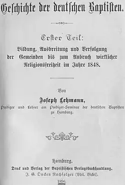 - ↑ Joseph Lehmann: Geschichte der deutschen Baptisten. 2., völlig neu bearbeitete Ausgabe von F. W. Herrmann. Band 2, Oncken, Cassel 1922, S. 292.