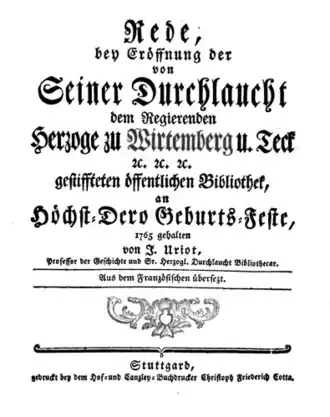 - Rede, bey der Eröffnung der von Seiner Durchlaucht dem Regierenden Herzoge zu Wirtemberg u. Teck ... gestiffteten öffentlichen Bibliothek, an Höchst-Dero Geburts-Feste, 1765 gehalten, Stuttgart: Cotta 1765.