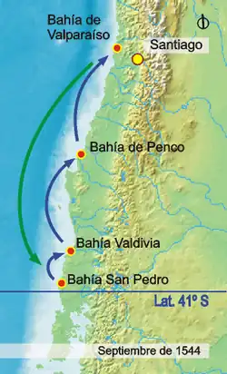 Im August 1544 wurden die beiden Schiffe San Pedro und Santiaguillo in Valparaíso ausgerüstet. Pedro de Valdivia ernannte Pastene am 3. September zum Teniente General en el Mar (etwa: Generalleutnant zur See). Einen Tag später segelte Pastene dann zusammen mit Jerónimo de Alderete, dessen Stellvertreter Rodrigo de Quiroga sowie mit dem Sekretär Valdivias Juan de Cárdenas (oder Juan de Cardeña) von Valparaíso aus in Richtung Süden los. Dreizehn Tage lang wurde ihre Expedition von Nebel behindert, dann wurde die Sonne sichtbar und sie stellten fest, dass sie bis 41¼° Süd gelangt waren. Daraufhin kehrten sie um in Richtung Norden und begannen die Küste zu erkunden und gegen Abend ankerten sie in einer lang gezogenen Bucht die ihnen sicher erschien. Am darauf folgenden 18. September gingen Pastene, Alderete und Cardeña mit einigen bewaffneten Männern an Land und erklärten in einer kurzen Zeremonie das erreichte Gebiet und dessen Einwohner zum Eigentum des spanischen Königs und seines Statthalters Valdivia. Alderete leitete die Zeremonie und Cardeña stellte dabei eine Urkunde aus.[25] Sie nahmen einige Indios gefangen, die sich in Neugier genähert hatten, kehrten zurück zum Schiff und setzten ihre Expedition fort. In dieser Weise vollzogen sie überall, wo es ihnen angebracht erschien einen Akt der Besitzergreifung, und manchmal verließen sie dazu nicht einmal das Schiff. Am 30. September 1544 endete die Expedition in Valparaíso.[26]