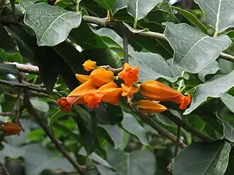 Die Blütenstände sind Rispen die an den Enden der Zweige stehen. Die Blütenstiele sind bis 12 mm lang. Die zwittrigen und fünfzähligen Blüten besitzen einen bis 40 mm langen, rippigen und orangen Kelch, der an der Außenseite dicht, fein drüsig behaart ist. Er ist bis etwa zur Hälfte in eilanzettliche, spitze Zipfel geteilt und auf der Innenseite mit einigen Haaren besetzt. Die orange, außen feinhaarige Krone ist bis 6 cm lang und damit deutlich länger als der Kelch. Sie ist röhrig verwachsen mit kleinen Zipfeln, auffällig fünfrippig und im oberen Bereich etwas erweitert.