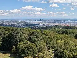 Von der kreisringförmigen Aussichtsplattform mit etwa 5 m Durchmesser in 31 Meter Höhe über Grund (480 m ü. A.) hat man einen Rundumblick nach Westen über den angrenzenden Wienerwald und nach Osten über das Wiener Stadtgebiet.
