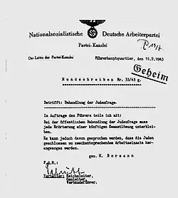 Der Nationalsozialismus propagierte im Anschluss an die Deutschvölkische Partei eine „Endlösung der Judenfrage“. Ab 1941 tarnte und rechtfertigte dieser Ausdruck die Durchführung des Holocaust.