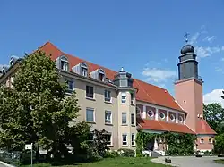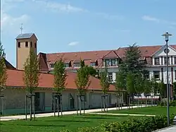 Zum Ensemble gehört die denkmalgeschützte zweischiffige Kirche, die in den Jahren 1925 und 1926 im barockisierendem Heimatstil errichtet wurde: sie enthält teilweise expressionistische Motive.