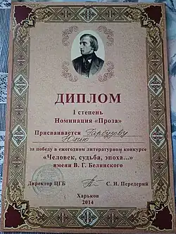 - ↑ Конкурс «Людина. Доля. Епоха» успішно завершено. [Der Wettbewerb „Mensch. Schicksal. Epoche.“ wurde erfolgreich beendet]. In: belinskogo.kh.ua. 13. Juni 2014, abgerufen am 31. Oktober 2024 (ukrainisch).