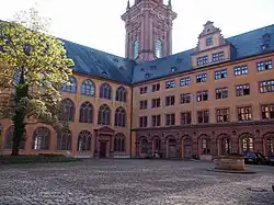 Im Jahr 1591 wurde das von Julius Echter in Auftrag gegebene vierflügelige Universitätsgebäude mit dazugehöriger Kirche (Neubaukirche) fertiggestellt, heute Alte Universität genannt. Dort waren Theologen, Juristen und Geisteswissenschaftler untergebracht. Die Medizinische Fakultät fand ihre Heimstatt im Juliusspital. Architekt des Gebäudes mit der in einen Winkel integrierten Neubaukirche war mit ziemlicher Sicherheit Georg Robin.[24]