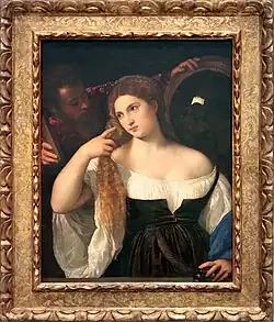 Tizian stellt eine sinnliche junge Frau vor, die träumend in der einen Hand ihre Haarflechte und in der anderen einen Tiegel hält. Sie trägt ein grünes Kleid mit Schultergurten und eine plissierte weiße Bluse, die offen ist und ihre linke Schulter entblößt. Ein bärtiger Mann in einem roten Wams steht hinter ihr und hält zwei Spiegel für sie, einen vorne und einen hinten. Die beiden Figuren füllen das gesamte Gemälde aus. Die junge Frau neigt ihren Kopf leicht zur Seite, und dies zusammen mit dem Blick ihrer blauen Augen. Blasser Teint, nackte Schultern und lockeres, welliges, blondes Haar machen sie zu einer idealisierten Darstellung venezianischer Schönheiten des frühen 16. Jahrhunderts.[3]