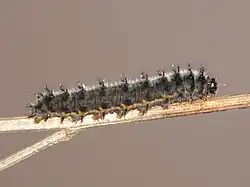 Die junge Raupe frisst zunächst die Eischale. Sie ist gelblich orange gefärbt. Die Körperoberfläche ist mit kleinen Warzen und dünnen dunklen Härchen bedeckt. Die Kopfkapsel ist schwarz. Im weiteren Verlauf der Entwicklung ändert sich die Farbe der Raupe von glasig grün über bräunlich bis hin zu schwarz. Ausgewachsen zeigt sie auf der Körperoberfläche viele schwarze verzweigte Dornen und dünne kurze weiße Härchen sowie einen orangefarbigen Seitenstreifen. Sie erreicht dann eine Länge von 45 Millimetern.[2]